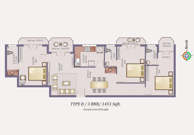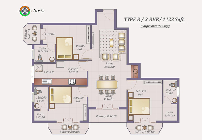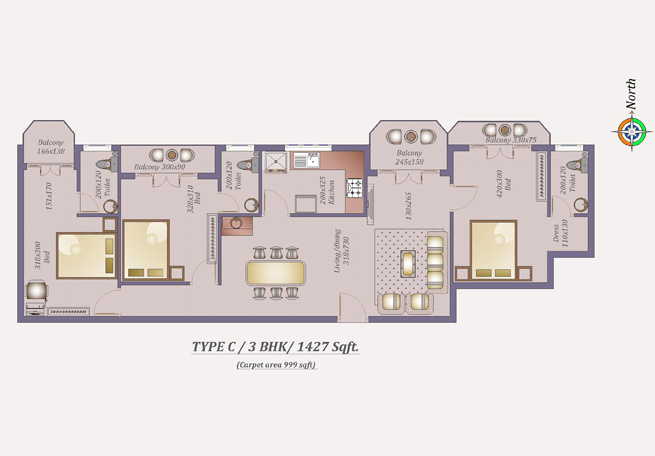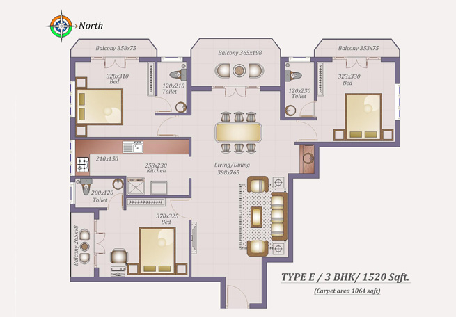 | Living & Dining | 60cm x 60cm Vitrified tiles |